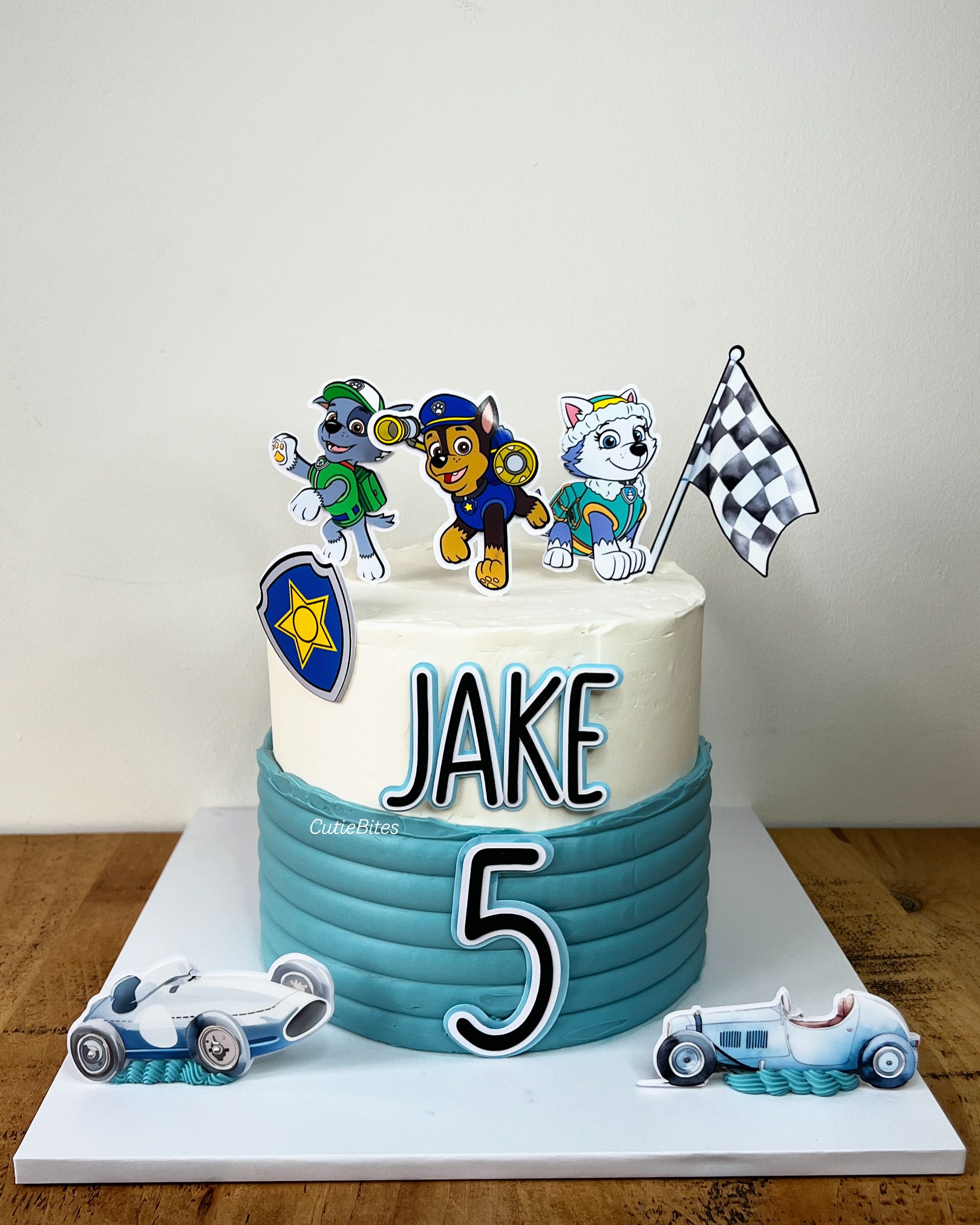Decorated in a striking blue-and-white colour palette with a textured lower tier, the cake is personalised with your child’s name and age, making it an exciting centrepiece for any pup- or racing-themed celebration.